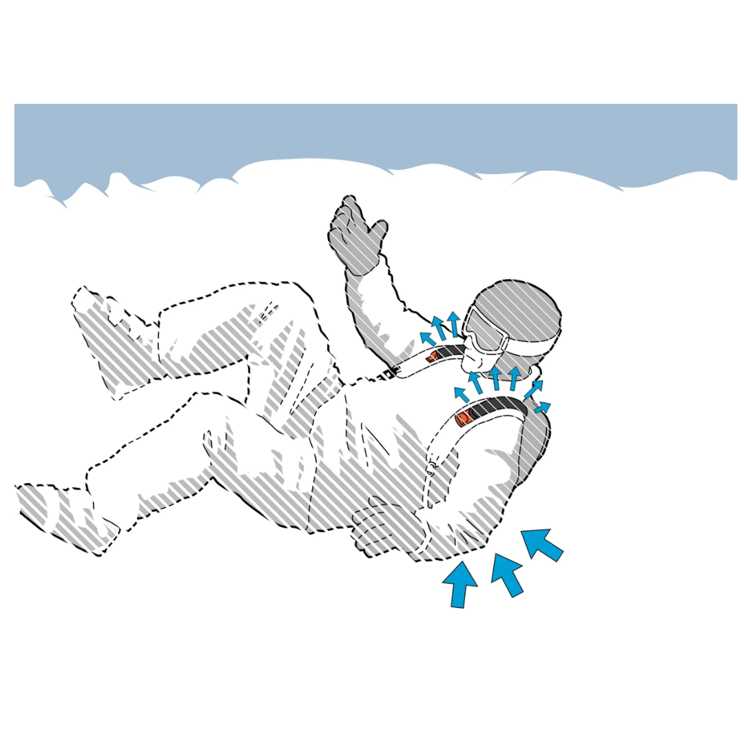 During burial, SBX uses the air in the snowpack as the victim’s fresh air supply, continuously pumping up to the breathing area for the duration of burial. SBX pumps air through the intake window on the backpack, up to the outlets on the shoulder straps.